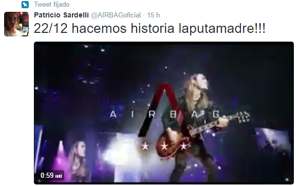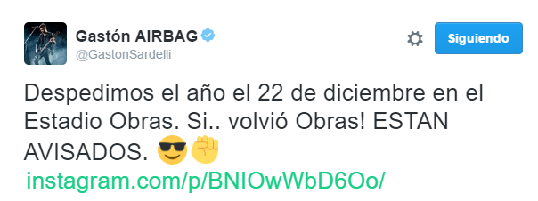 Después de una pausa durante la cual permaneció cerrado, el Estadio reabre sus puertas el próximo 22 de diciembre para recibir a Airbag. Así lo confirmaron en sus redes los hermanos Sardelli: "Vuelve el Rock al Templo!" dijeron al pie del video que compartieron en su cuenta oficial de Instagram. Hace dos días atrás, Pato había creado expectativa con una publicación que anunciaba "22-12-16 hacemos historia…". Ayer, finalmente, dieron a conocer a sus fans este inesperado show. "Volvió Obras! ESTÁN AVISADOS" dijo Gastón a sus seguidores.