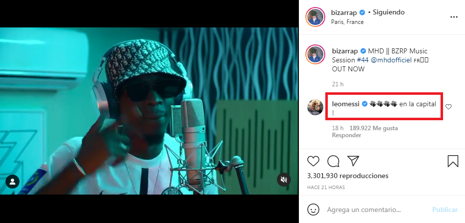 Por si fuera poco, esta sesión con MHD, la primera con un rapero francés, está inspirada en Leo Messi ¡y el futbolista no tardó en reaccionar al estreno! Horas más tarde del debut de Messi en la Champions e inmeditamente después del estreno de la sesión, comentó el último post del productor utilizando una de las frases de la canción: ”En la capital” junto con emojis de aplausos.