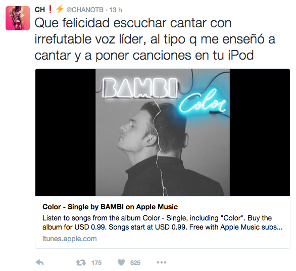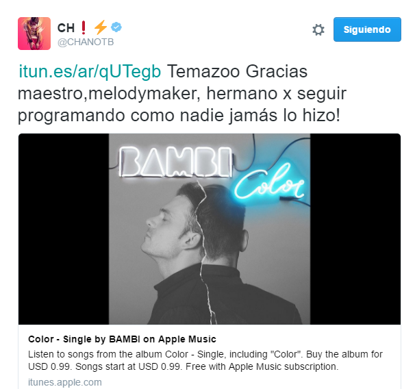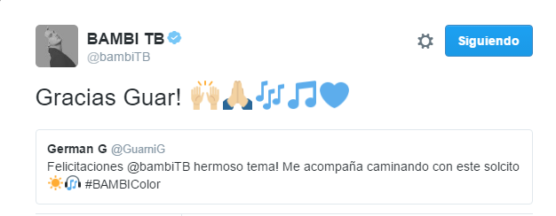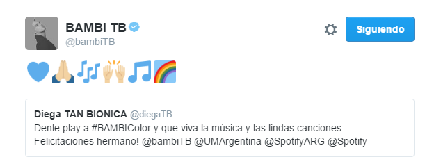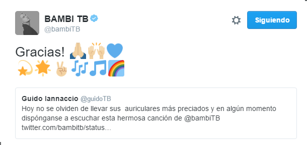 En su cuenta de Twitter tuvo un lindo diálogo con su hermano Chano, que elogió y promocionó este primer corte. Además también lo saludaron y felicitaron Diega (batería de TB), Guarni (tecladista) y Guido (manager de la banda).