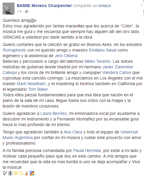 Bambi Moreno Charpentier lanzó esta mañana el primer corte solista de su futuro disco. El tema se llama “Color” y tiene una letra sentida y melancólica que habla de una experiencia que le tocó vivir.