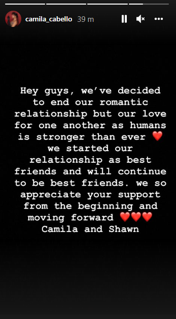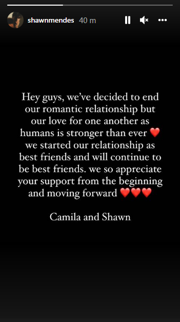 La pareja decidió poner punto final a su relación y lo anunció en su cuenta de Instagram con un triste mensaje. Sin embargo, Camila y Shawn aclararon que, a pesar de la ruptura, continuarán siendo “mejores amigos” como el primer día…