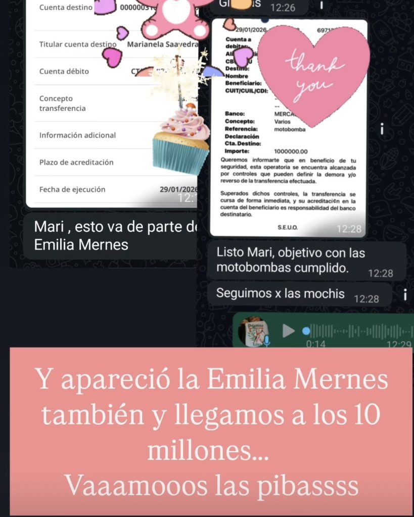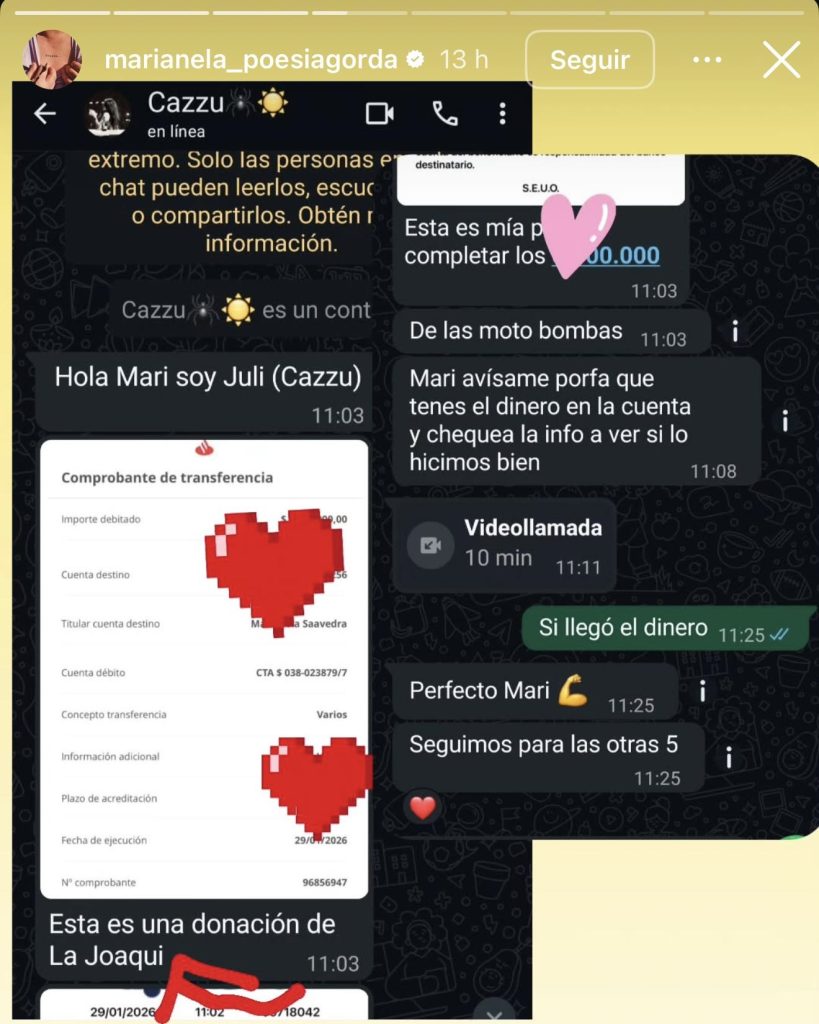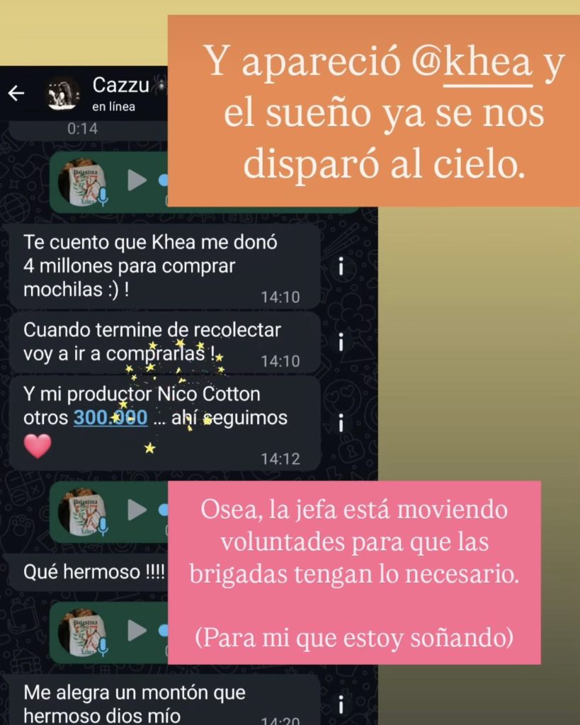 Una colecta que comenzó con la meta concreta de reunir fondos para adquirir diez motobombas y treinta mochilas de agua, logró reunir más de 10 millones de pesos gracias al aporte de artistas como Cazzu, que fue la primera en contactarse con la joven y logró el aporte de otros artistas como Luck Ra, La Joaqui, Maria Becerra, Emilia y Khea, para brindar apoyo en la grave situación que se vive en el Sur del país.
