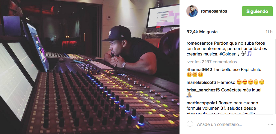 Romeo Santos, por el contrario, compartió una foto en la se lo ve en su rol de productor muscial, concentrado en plena mezcla de su nuevo trabajo Golden, y pidió perdón a sus seguidores por no subir fotos con tanta frecuencia. “Mi prioridad es crearles música” declaró el cantautor en la publicación. Los fans tendrán que esperar porque el disco será lanzado recién en 2017.