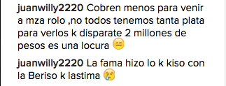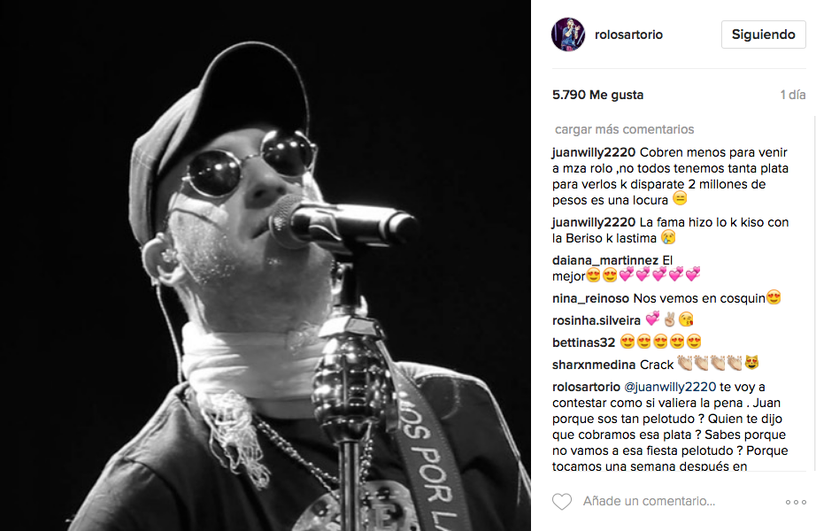 Fue en una foto que Rolo Sartorio compartió en su cuenta de Instagram que se originó un duro intercambio con un fanático. “Cobren menos para venir a mza rolo, no todos tenemos tanta plata para verlos k disparate 2 millones de pesos es una locura” escribió el fan al pie de la publicación. “La fama hizo lo k kiso con La Beriso k lastima”, agregó el seguidor.