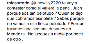 Las fuertes palabras molestaron al cantante que le respondió duramente: “Te voy a contestar como si valiera la pena. Juan porque sos tan pelotudo? Quien te dijo que cobramos esa plata? Sabes porque no vamos a esa fiesta pelotudo? Porque tocamos una semana después en Mendoza. No juzgues a nadie por boca de otro.”, le explicó Rolo haciendo referencia a la apretada agenda de la banda.