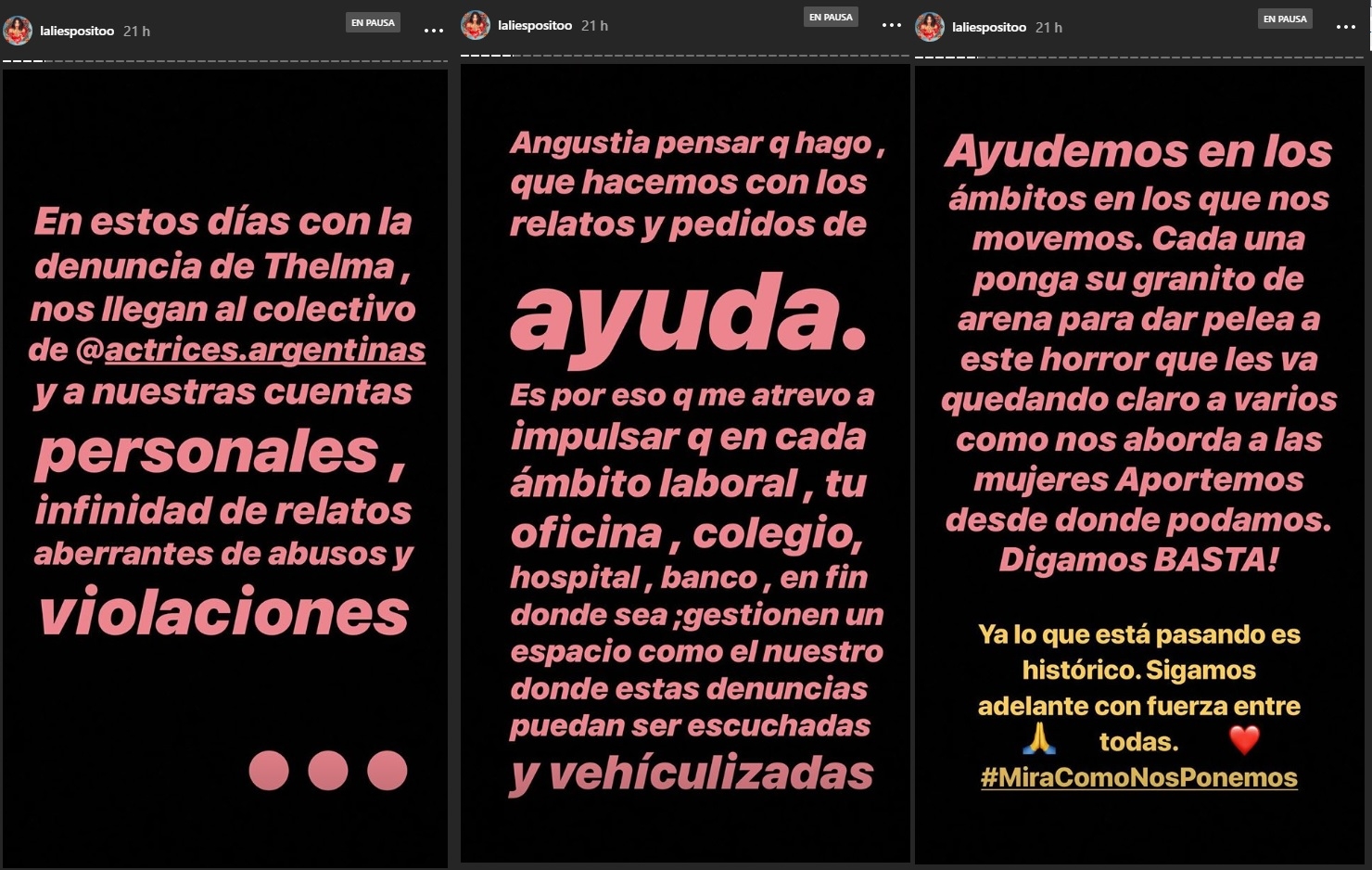 Luego de que se hiciera pública la denuncia de la actriz argentina Thelma Fardin contra Juan Darthes, muchos fueron los músicos que no dudaron en expresarle su apoyo a través de las redes sociales y se sumaron al hashtag #MiraComoNosPonemos. Una de ellas fue Lali Espósito, que desde el primer día se mostró profundamente conmovida.Hace unas horas, la cantante volvió a hacerlo con una emotiva serie de stories que compartió en su cuenta de Instagram.A través de ellas, Lali expresó su angustia y se animó a dejar un importante mensaje para todas las mujeres: “Me atrevo a impulsar que en cada ámbito laboral, tu oficina, colegio, hospital, banco, en fin donde sea, gestionen un espacio como el nuestro dónde estas denuncias puedan ser escuchadas y vehículizadas”, escribió y seguido agregó: “Aportemos desde donde podamos. Digamos BASTA!”.