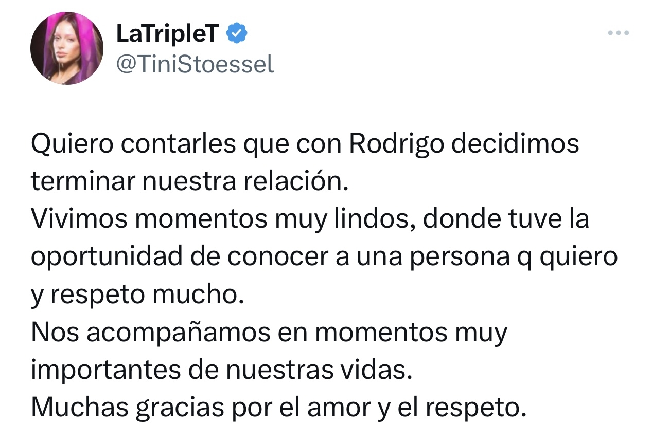 Por medio de un comunicado que compartió en sus redes sociales, TINI confirmó oficialmente su separación del futbolista Rodrigo De Paul. Así lo anunció: