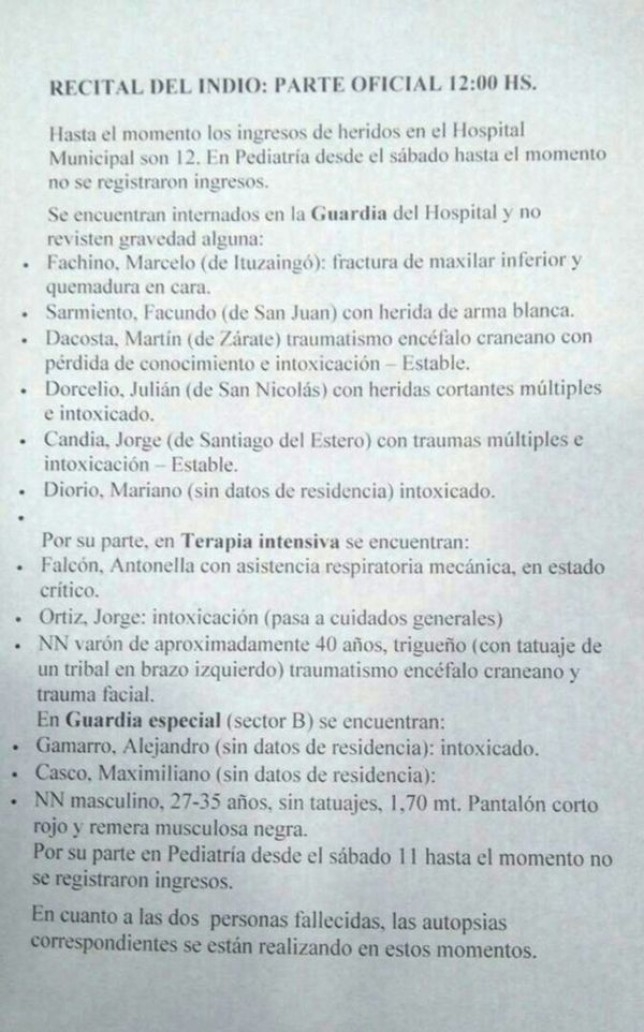 El desbordado predio La Colmena de la ciudad bonaerense de Olavarría, fue escenario de una trágica noche. Las más de 200 mil personas que asistieron al show causaron una serie de avalanchas que terminó con un saldo de dos muertos y decenas de heridos. Aunque en varias ocasiones, el Indio paró el show y se dirigió al público con duras palabras, la situación no mejoró. A esto se sumó la desconcentración, que rápidamente se transformó en un caos total. Un día después las consecuencias siguen impactando.