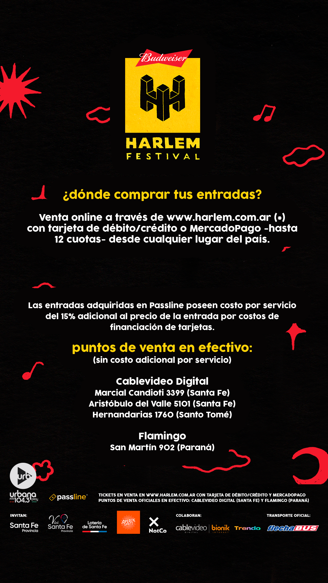 Dos días, dos escenarios y 32 horas de música, entretenimiento y gastronomía. ¿Qué esperas? Las preventas ya están agotadas, pero podés conseguir tus entradas entrando ahora a: www.harlem.com.ar.