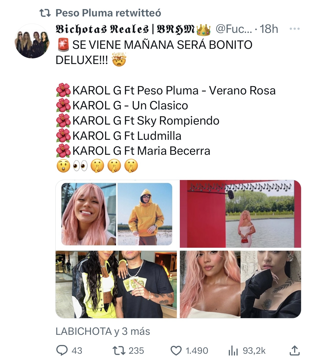 Hace unas horas, Peso Pluma compartió un tuit que detallaba las supuestas colaboraciones de “Mañana Será Bonito” versión DELUXE. “Verano rosa” es el título de esta supuesta canción que ojalá no sea solo un rumor.