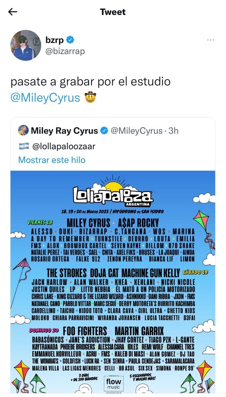 Después de que se publicara el lineup completo de la edición 2022 del Lollapalooza Argentina, Bizarrap no tardó en hacerle una inesperada invitación a Miley Cyrus…
