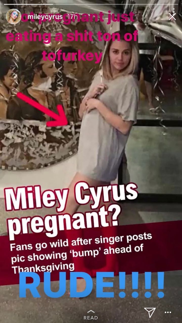 ¡Pero todavía no está entre sus planes! Miley no se quedó callada y negó los rumores con una publicación muy singular: “No estoy embarazada, solo estoy comiendo un montón de pavo”, escribió la cantante en sus stories de Instagram, sobre una noticia que hacía referencia al tema. “¡GROSEROS!”, agregó notablemente molesta. ¡Mirá!