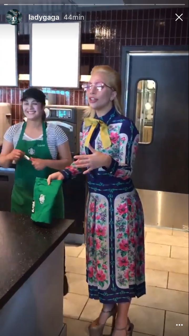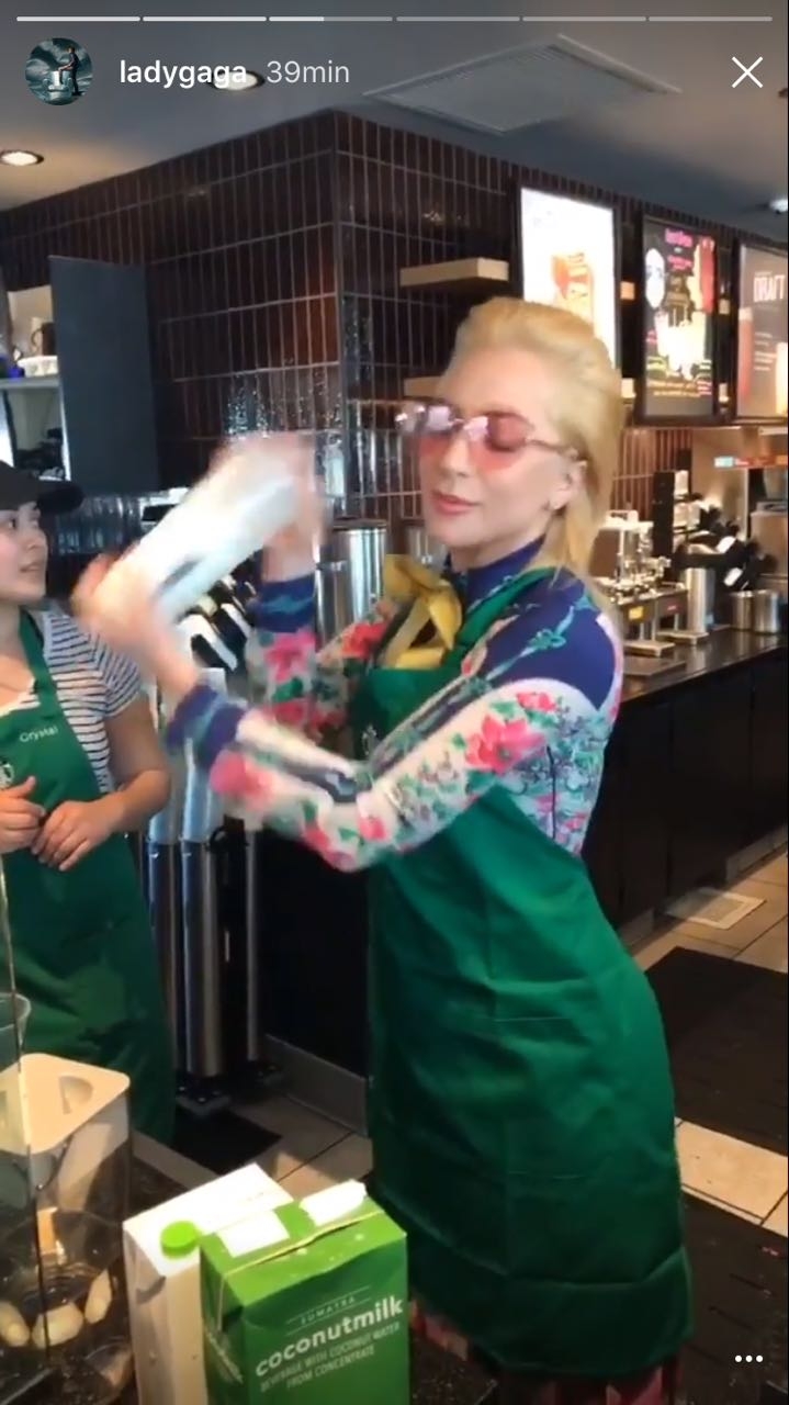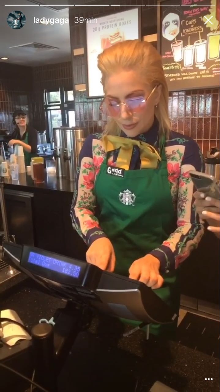 Hoy, fue la misma Lady Gaga quien sorprendió a todos los clientes que se acercaron a Starbucks. Con su estilo intacto, pero protegido por un delantal con su nombre, la reina del pop preparó sus propias bebidas e incluso las cobró.