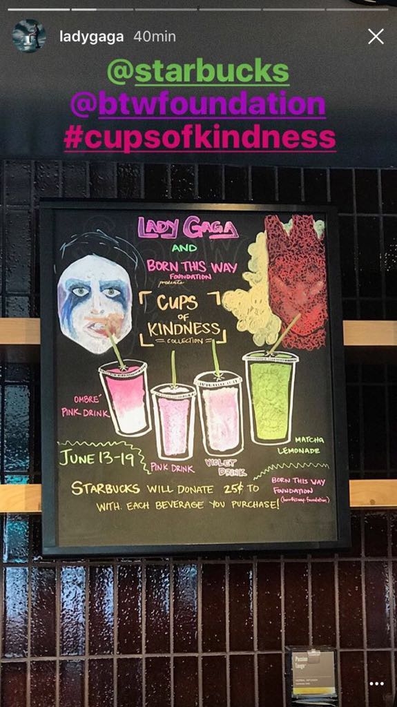 Por cada compra de una de estas bebidas, Starbucks donará U$S 0.25 a la Fundación Born This Way. Esta ONG, creada por la misma cantante en 2012, está dedicada a la asistencia de jóvenes que padecen enfermedades mentales y de víctimas de bullying. “La bondad empieza con una taza” es el eslogan de esta campaña que Gaga difundió en todas sus redes sociales.