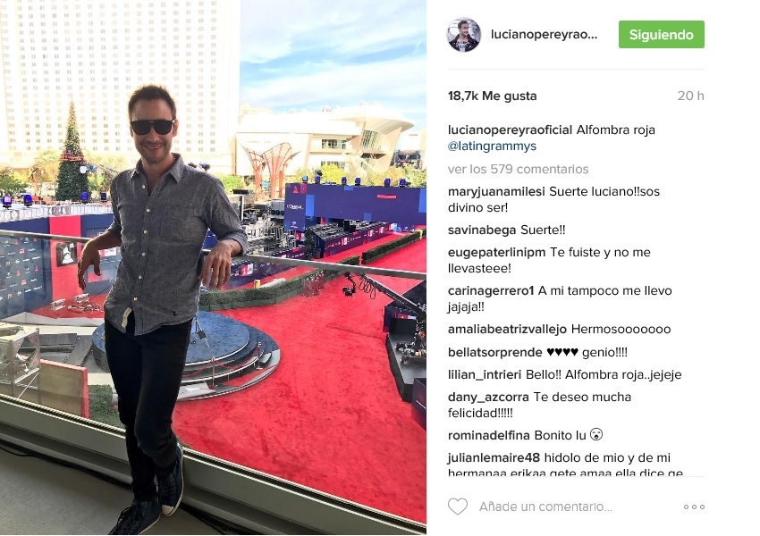 Luciano Pereyra prefirió revelar imágenes de la alfombra roja. “Empezamos a palpitar los #LatinGRAMMY desde #LasVegas y de #TuMano” escribió el cantante al pie de un video, haciendo referencia a la nominación de su disco en la categoría Mejor Álbum Vocal Pop Contemporáneo.