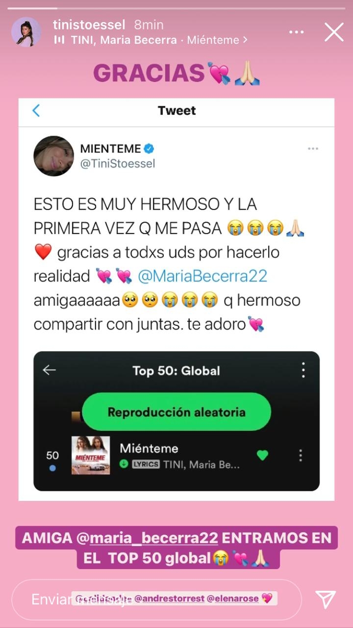 La útlima colaboración de Tini y María Becerra es un éxito sin precedentes. Desde el día de su estreno “Miénteme” no para de romper todo tipo de records ¡y hoy se suma uno nuevo! Luego de encabezar por varias semanas el puesto número en el Top 50 de Spotify Argentina, “Miénteme” acaba de entrar al Top 50 Global, convirtiendo a Tini y María Becerra en las primeras argentinas en la historia en entrar en esta categoría. ¡Asi como lo leen!