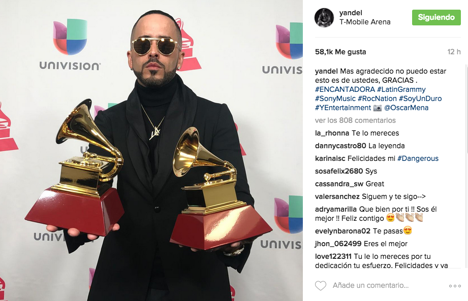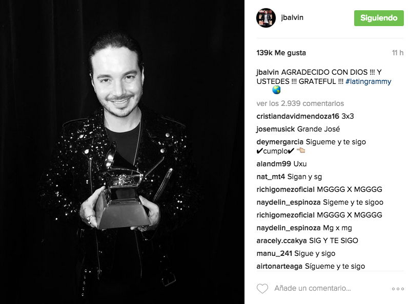 Desde Las Vegas, varias fueron las fotos que Carlos Vives compartió de la entrega. En una de ellas se mostró con dos premios Grammy sobre las manos: “en serio sin palabras no lo puedo creer!!!”. Con un video, agradeció especialmente a Shakira y le dedicó ambos premios. En otra de sus publicaciones manifestó “gracias por creer en nuestra música humilde”, haciendo referencia a su país de origen. Otro cantante colombiano que se mostró en redes fue Fonseca. Ganador en dos categorías, también posteó una foto en la que dijo simplemente “Gracias a la vida”.