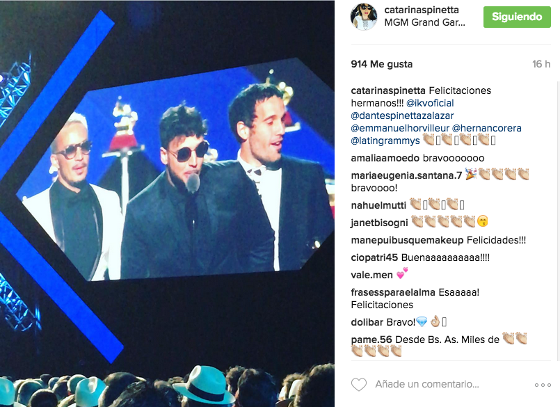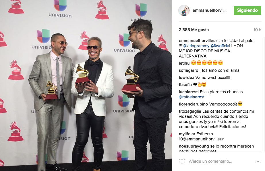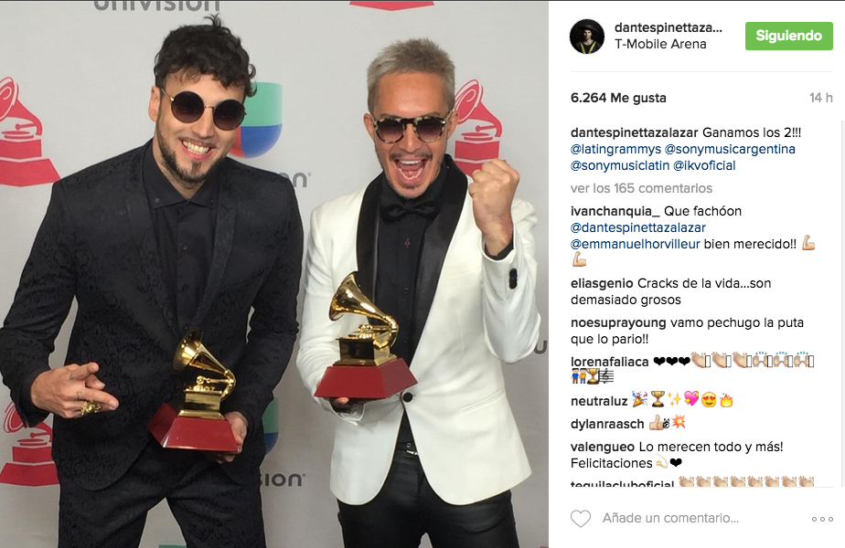 Dante Spinetta compartió con sus seguidores el instante en que se anunció sobre el escenario la victoria de IKV en la categoría Mejor Álbum de Música Alternativa. Su hermana Cata también festejó el triunfo de su hermano con un video en su cuenta oficial. Tras la ceremonia, el músico posteó una foto junto a Emmanuel Horvilleur en la que se los ve felices con sus dos premios. Este último lo dijo todo al pie de una publicación en su propia cuenta: “La felicidad al palo!!!”.