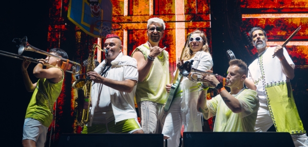 Con un montaje visual sorprendente, además de su característico despliegue festivo, sorprendieron al público con la incorporación de un aro de basquet en escena, sumando un elemento lúdico y original a su concierto.